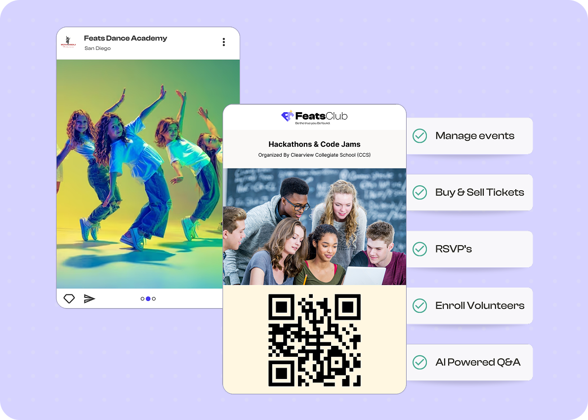 FeatsClub is the all-in-one platform for organizations to build communities, manage events, and track their members' achievements. We provide the tools you need to engage your audience, whether you're hosting a fundraiser, selling tickets to a workshop, or managing a membership program.