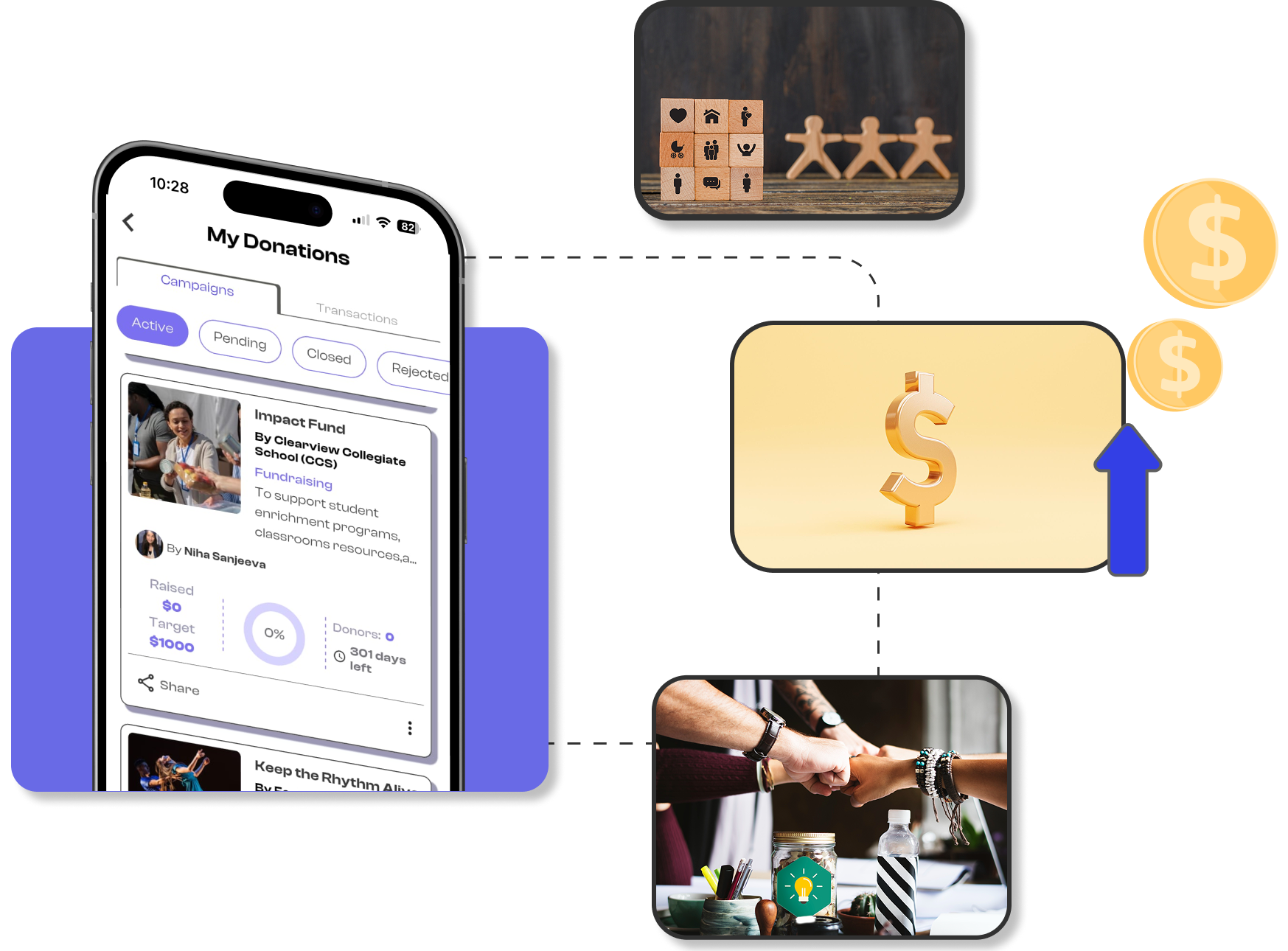Supporters (students, parents, alumni, fans) can create their own campaign pages with proceeds going directly to your org—perfect for micro-donations and school/academy drives.