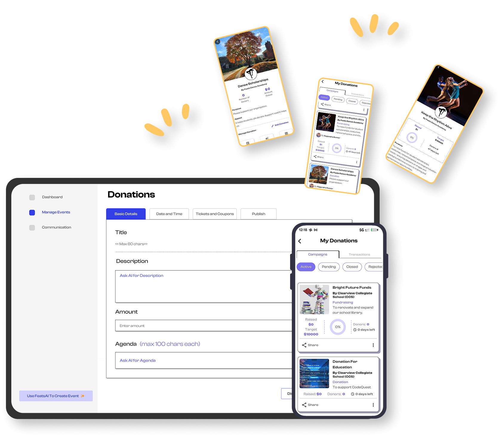 FeatsClub lets organizations launch donation campaigns directly—and empowers patrons, students, and supporters to start their own sub-campaigns with funds flowing to your organization. Combine micro-donations with events, share impact updates, and grow a loyal donor community that gives again.