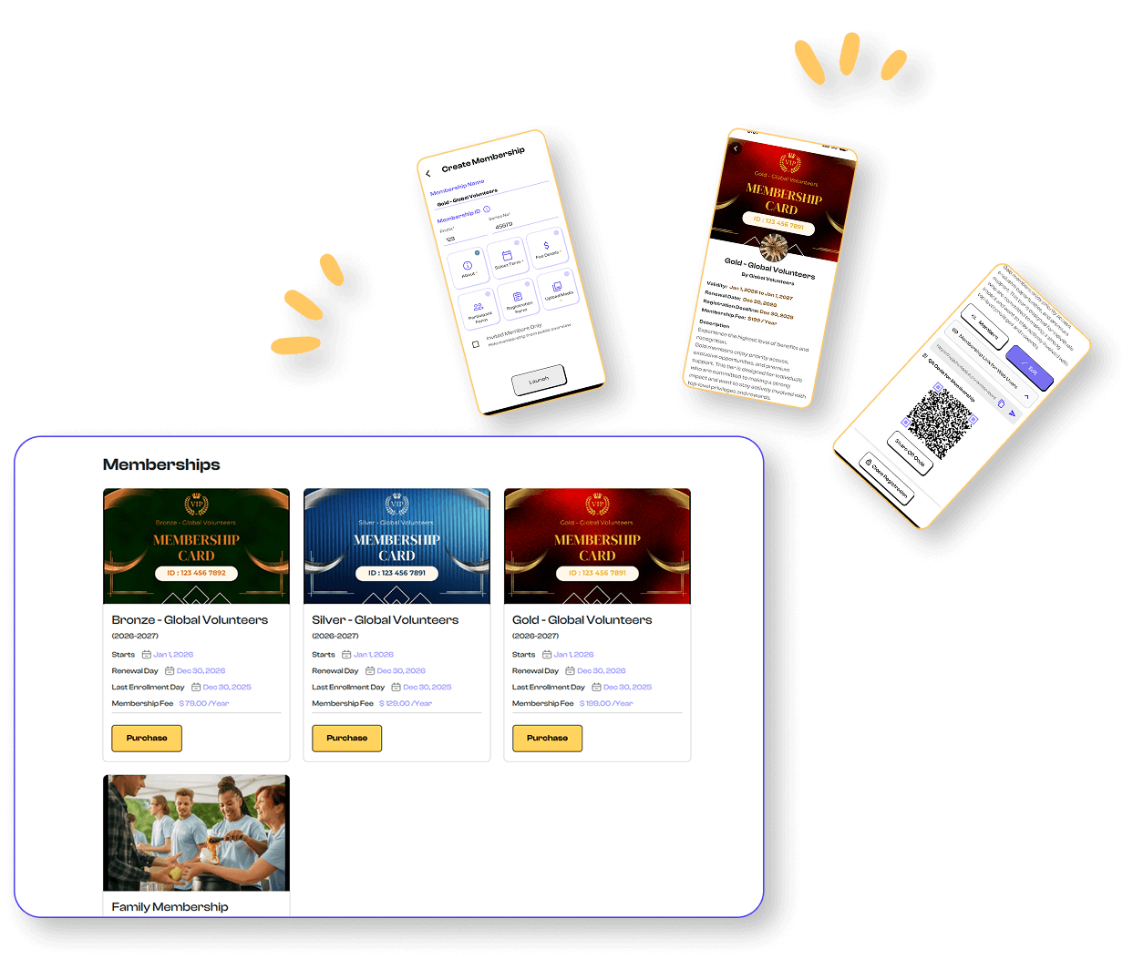 Each active member receives a digital membership card showing their name, photo, membership tier, validity dates, and a unique QR code for verification. Organizations can scan QR codes at events or venues.