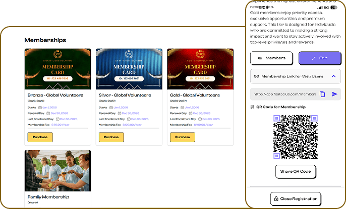 FeatsClub supports monthly, yearly, lifetime, and custom durations. Organizations can also set renewal reminders and grace periods.